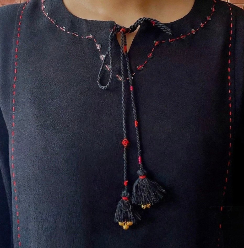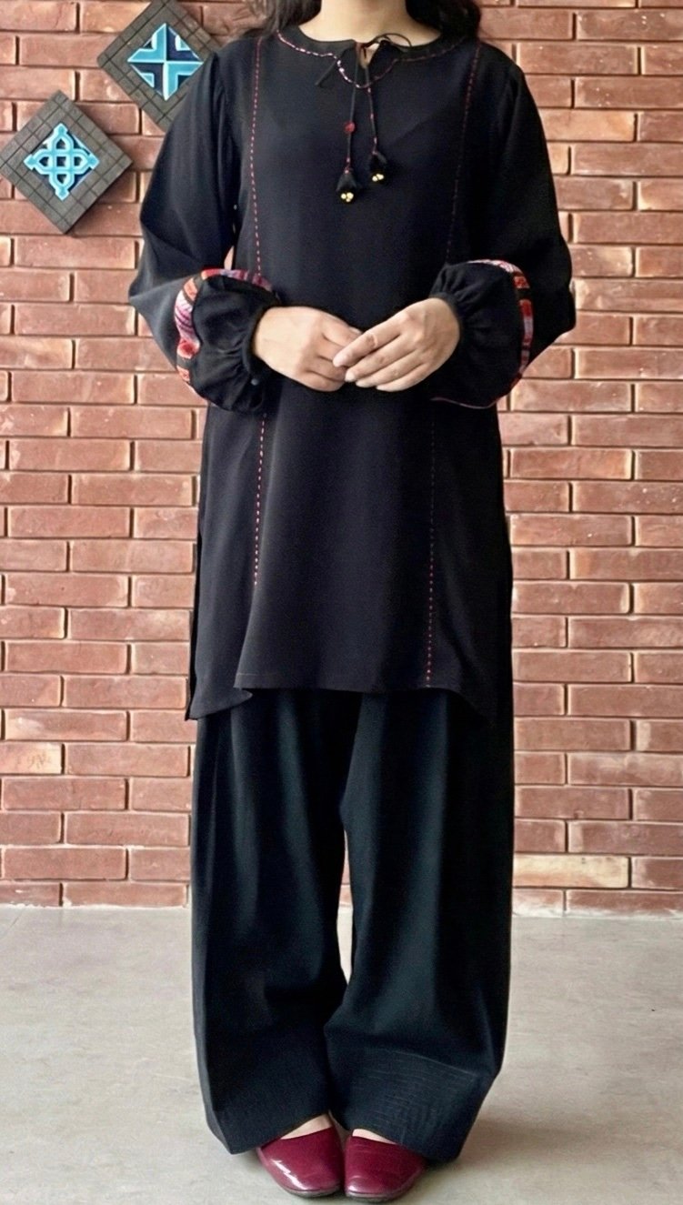 This stitched kali-dar Heer kurti can be your daily wear essential, its round neckline is embellished with sequence, embroidery and dori. Kali has running stitch all over in the front.
