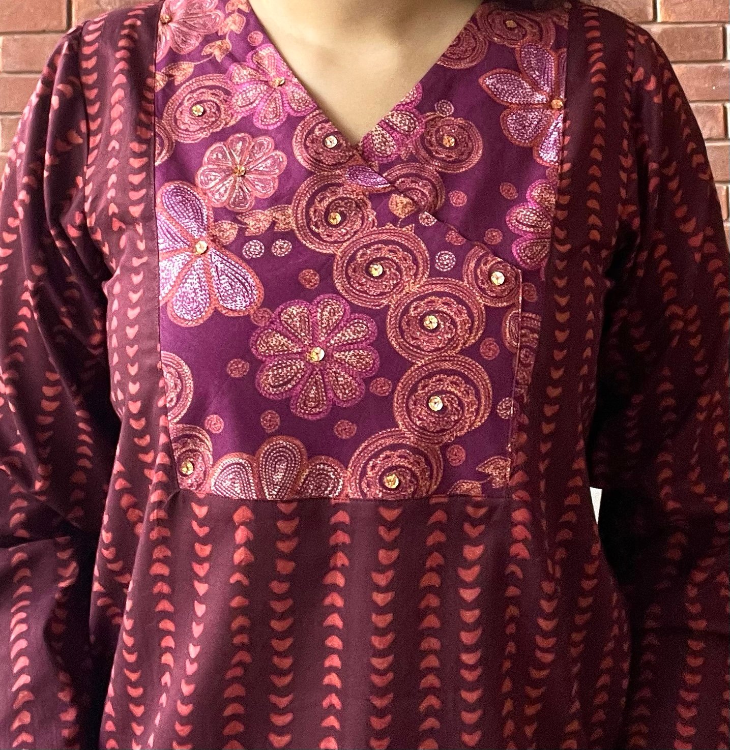 Its Angarkha Neckline has a printed patch with copper sequences (sitarey)