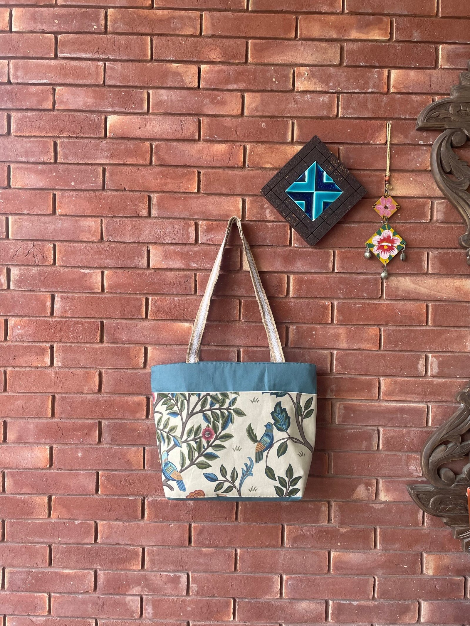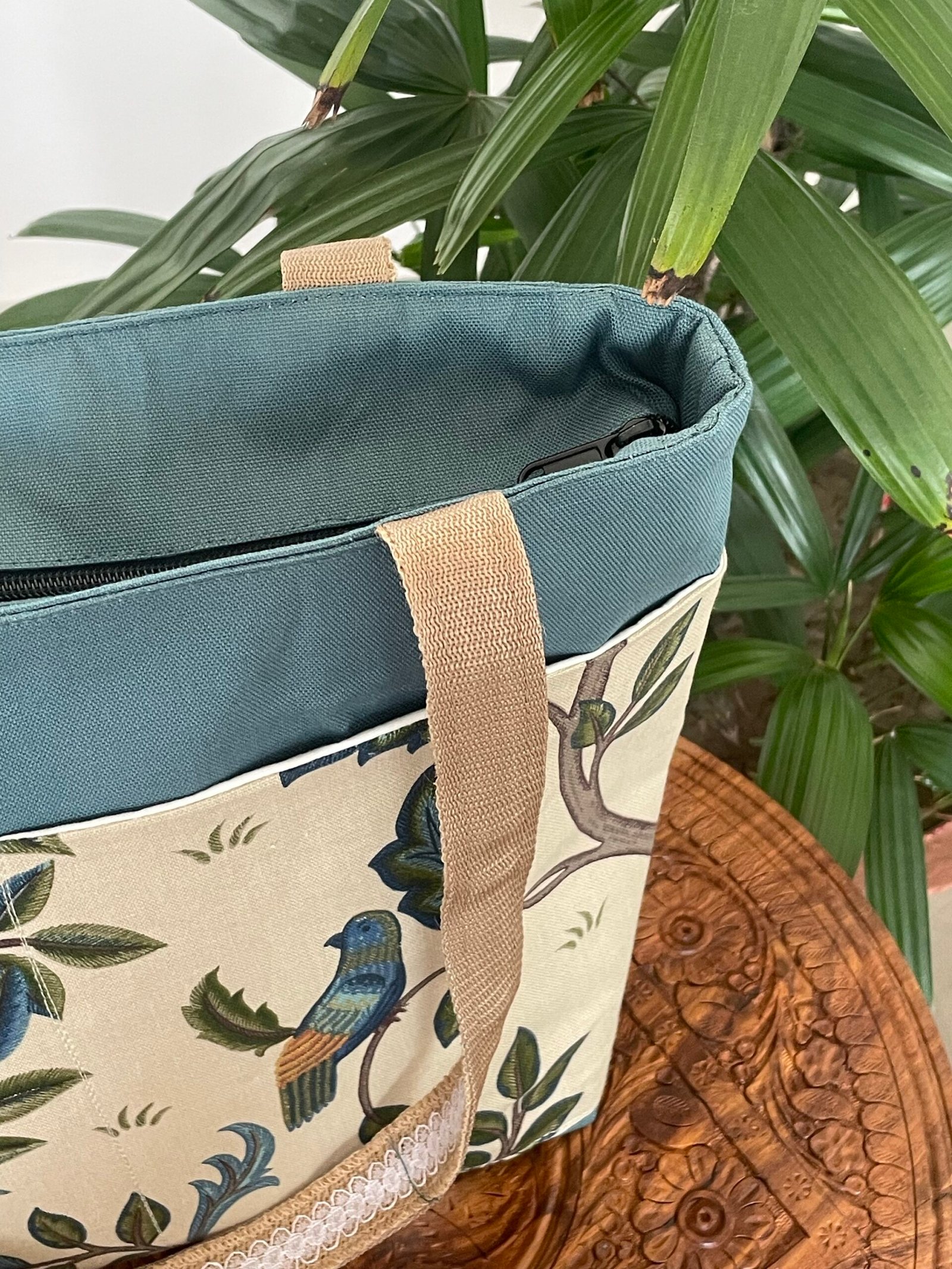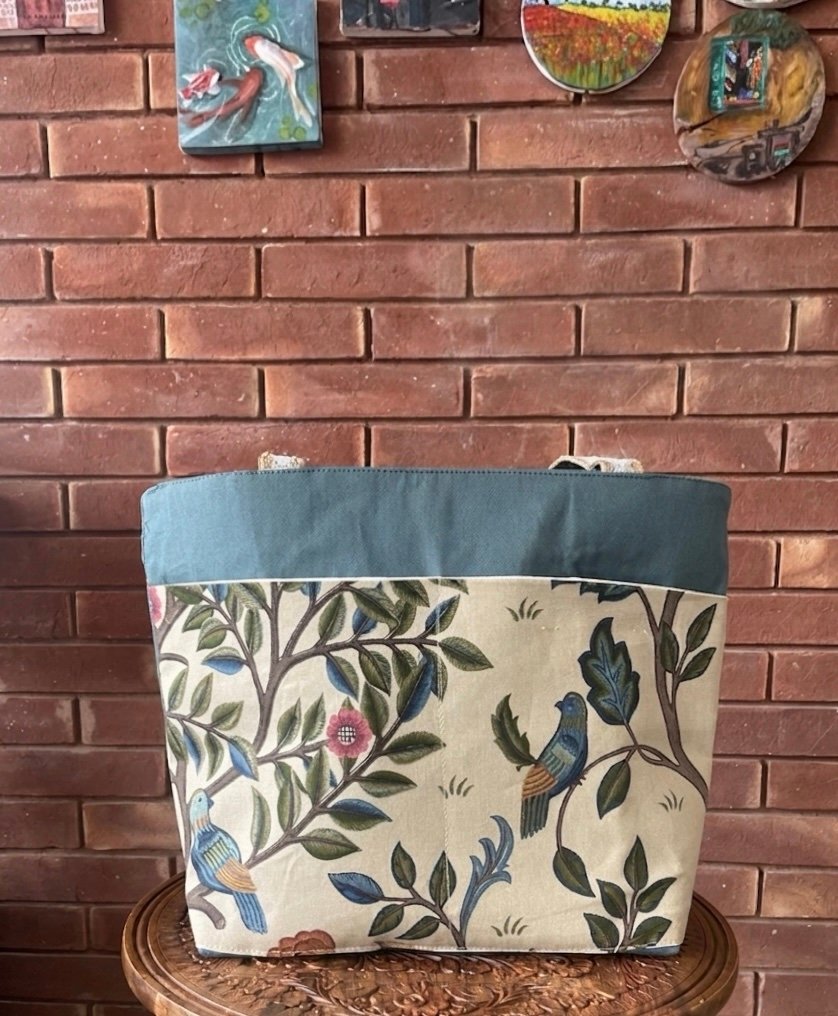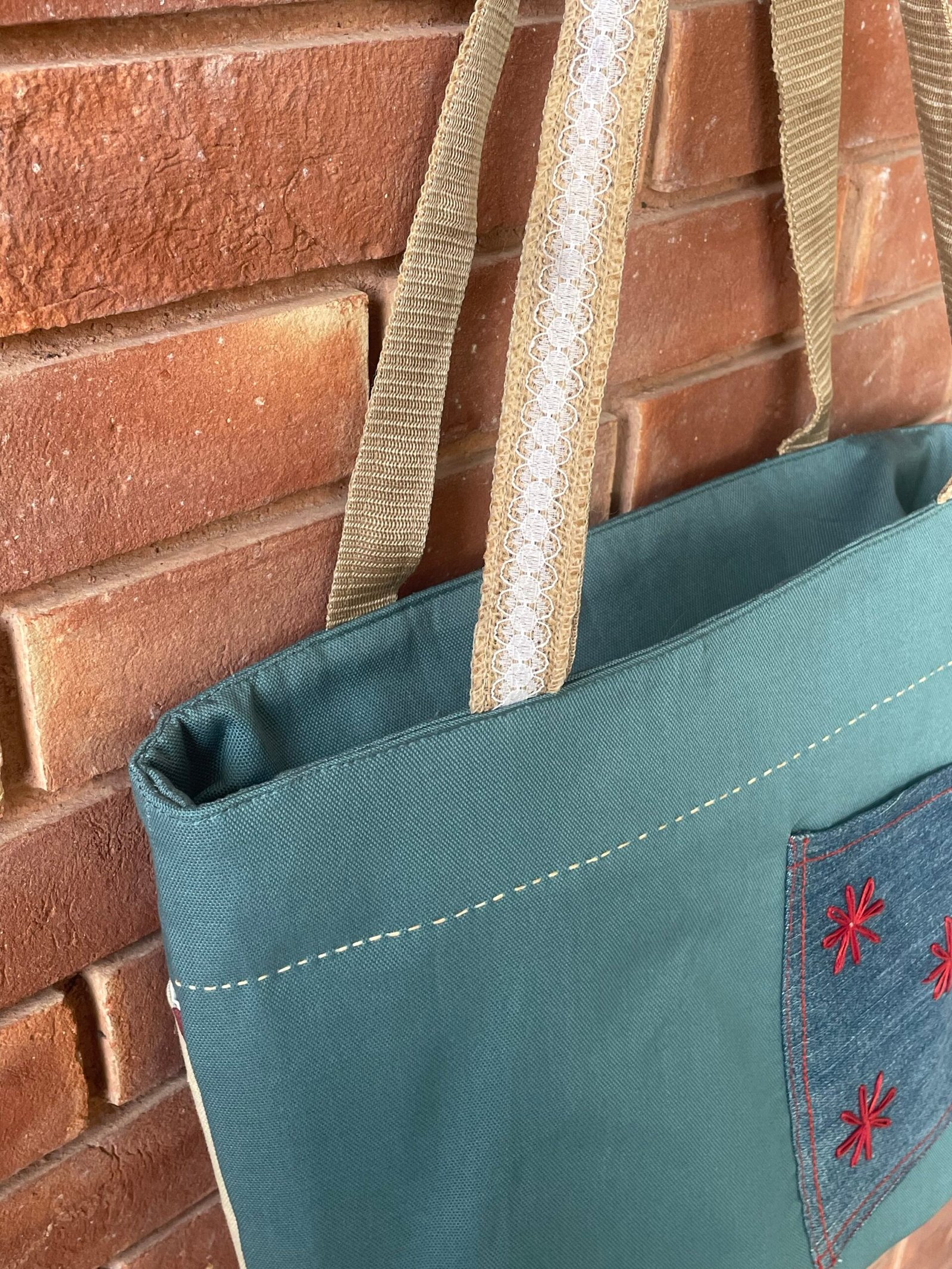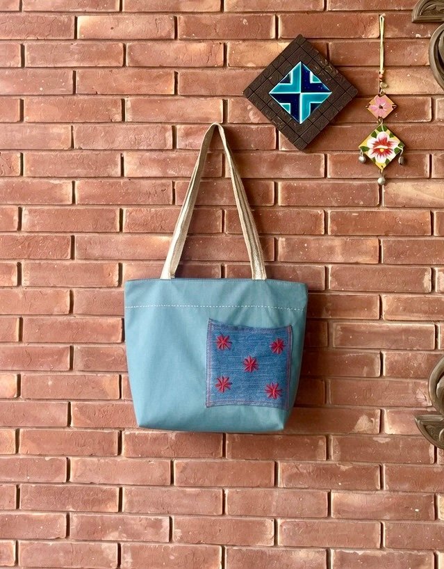 A teal coloured sturdy tote bag with two printed large outer pockets on one side and one denim embroidered pocket on other side, one inner pocket and a jute strap.